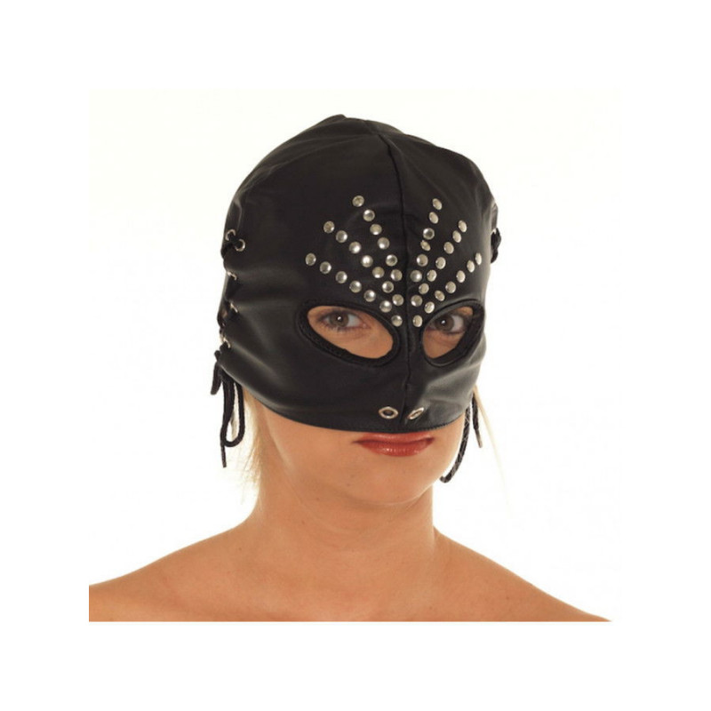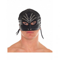 Masque en cuir nappa véritable model de chat décoré avec des rivets métalliques. Cette demi-capot est réglable avec lacets en coton sur les deux côtés.