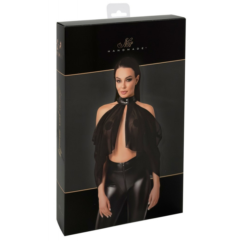 Fine transparence noire ! Top Orgia de Noir à la coupe ample et aérée, entièrement en tulle noir finement transparent. Style cape sans épaules avec tour de cou en powerwetlook, fermeture par boutons-pression sur le devant. Coupe asymétrique : court et ouvert devant, couvrant les bras et le dos. 95% polyester, 5% élasthanne. Pour Noir, il existe un tableau des tailles séparé.