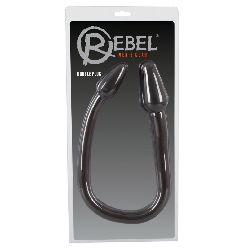 Double godemiché pour plus de plaisir seul ou à deux ! Double godemiché extrêmement flexible de Rebel avec un plug à chaque extrémité. Pour les jeux en solo, insérer le gode par voie vaginale et anale, pour les jeux à deux, chacun s'offre un des plugs. Surface soyeuse et glissante. Noir. Longueur totale 76,5 cm, Ø 2-5,1 cm. TPE.