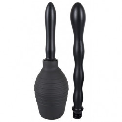 Pour un plaisir intime d'éclaboussure ! Douche intime noire (13 cm de haut, capacité 300 ml) avec deux embouts interchangeables à visser avec des buses de pulvérisation. Facile à nettoyer. Attache longue et ondulée : longueur totale d'environ 23 cm, Ø 1,7-3 cm. Attache courte et lisse : environ 11,5 cm de long (Ø 1,9-2,3 cm). Matériau : PVC.